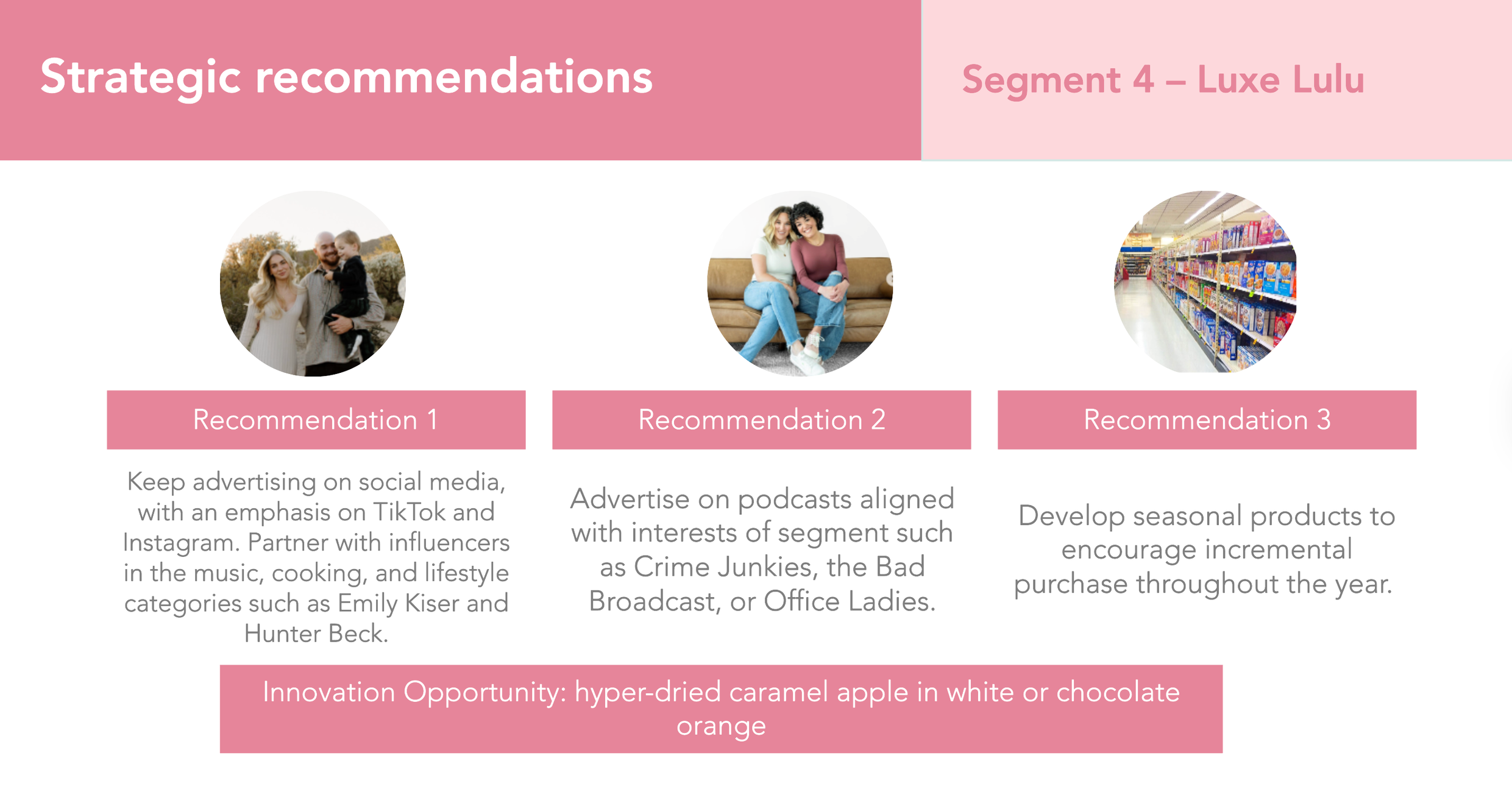 The segmentation provided Trü Frü with a clear, actionable roadmap for marketing and innovation. By combining analytics and creativity, the BYU Marketing Lab helped the brand define its most valuable audiences, refine its messaging, and uncover opportunities for continued growth in the premium snacking space.