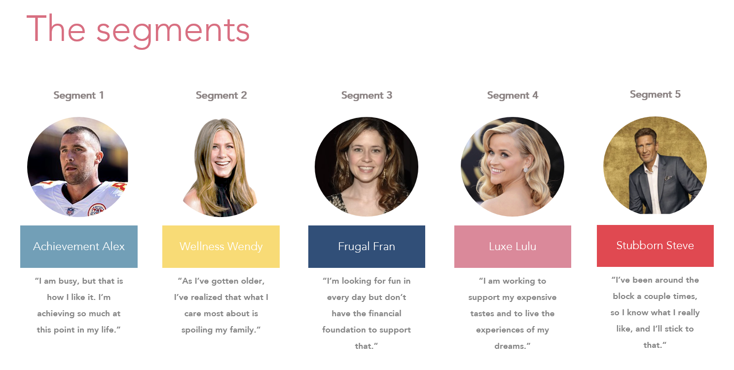 Five segments emerged: Achievement Alex, Wellness Wendy, Frugal Fran, Luxe Lulu, and Stubborn Steve. Each represented a distinct mindset and relationship with indulgence. The team then aligned these groups with Jungian brand archetypes to reveal emotional drivers such as ambition, creativity, and connection.